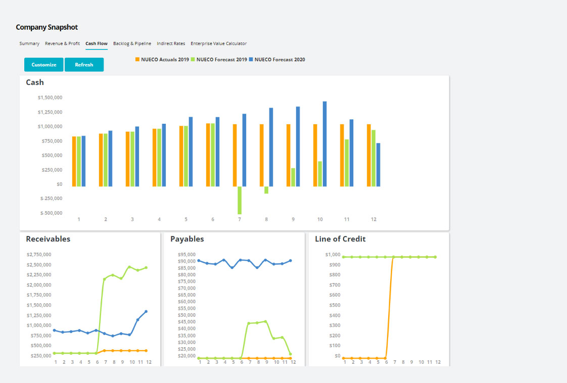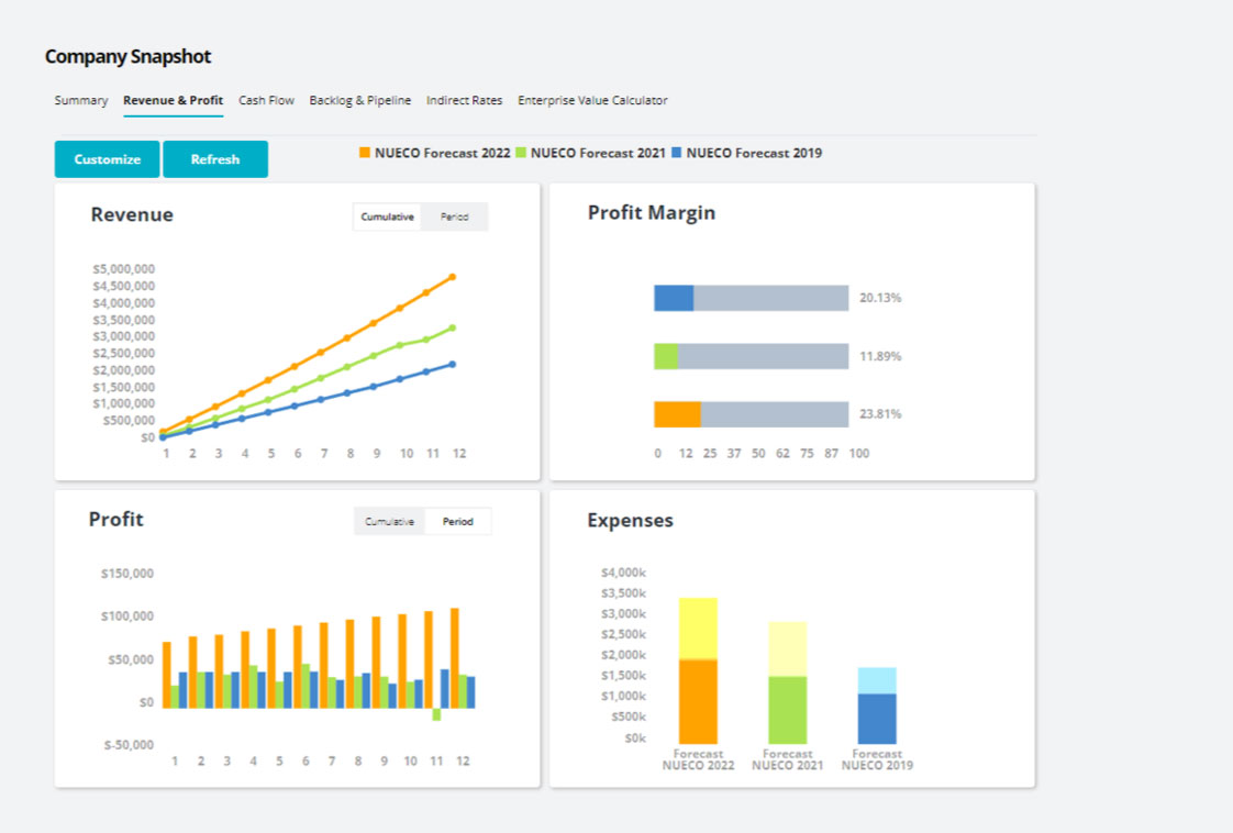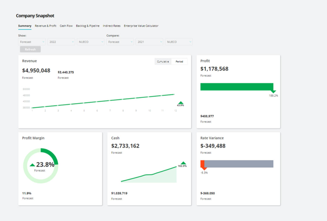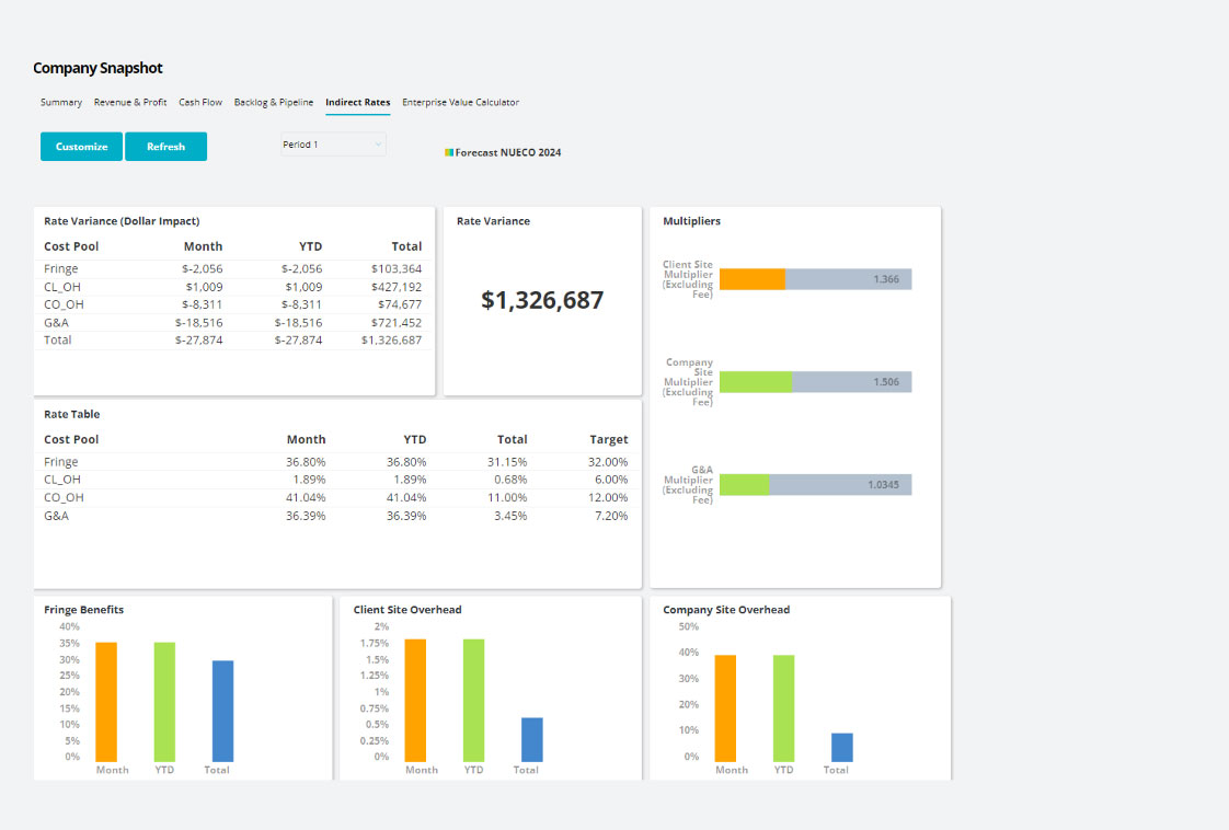Tailored for GovCon: FAR-aligned reporting that automates indirect rate forecasts, waterfalls, and pipeline pricing.