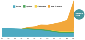 This version of the plan is the most visually dramatic: a steady state of revenue from active work, followed by a massive surge in new business right at the end of the year.